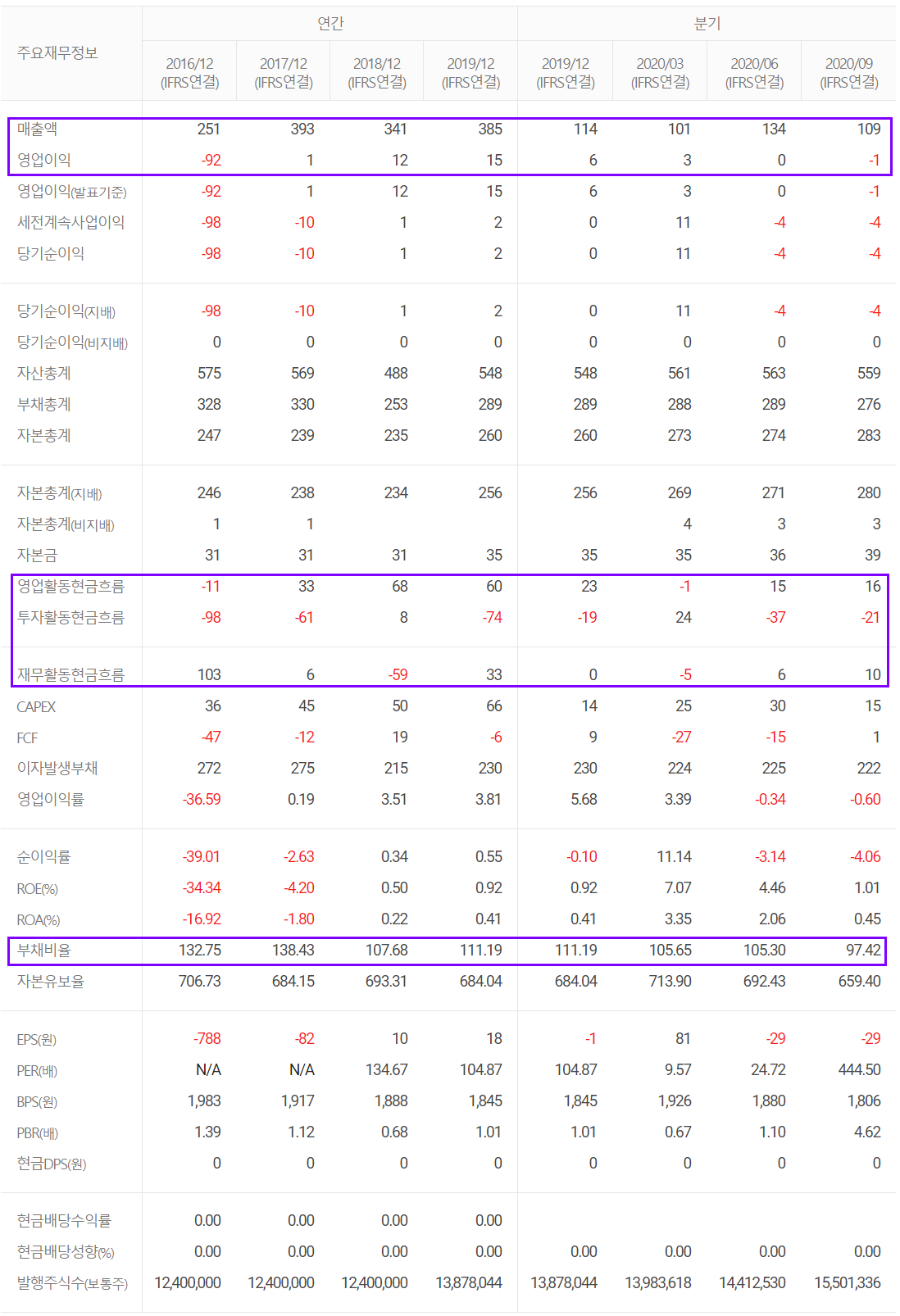 부채비율은 2020년 3분기 말 기준 97.42%로 지난 5년 간 감소 추세에 있습니다. 영업활동 현금흐름이 주춤한 상태이지만, 제품 다각화 및 신제품 개발 등으로 개선되는 모습입니다.