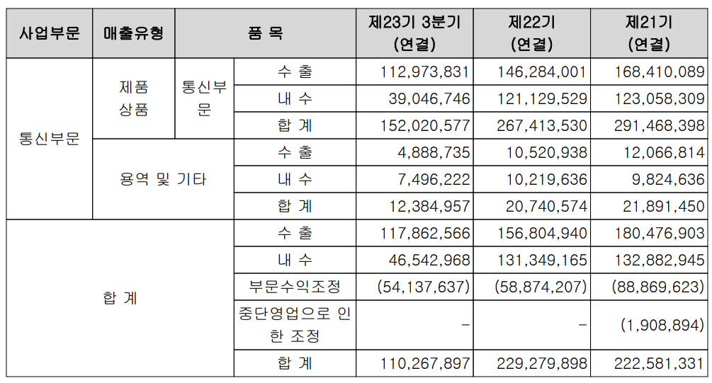 2020년 3분기 말 기준으로는 지난 2년에 비해 내수의 비중이 크게 감소했습니다. 코로나19 영향으로 인한 통신사의 투자 지연이 주요인으로 추정됩니다. 부문 간 수익 조정 분은 부문 간 매출거래를 독립된 당사자 간의 거래조건에 따라 이루어진 것처럼 회계처리를 해서 발생합니다. 요약하자면 내부 거래를 제외한 부분이 손익계산서에 반영됩니다.