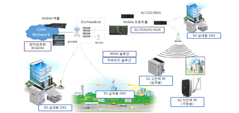 파장분할다중전송 방식을 사용한 광가입자망인 WDMPON은, 광가입자망의 트래픽 병목현상을 해결함은 물론 고속 데이터 전송을 위해 가입자 당 독립 파장을 할당함으로써 보안성이 보장되는 차세대 WDM 기반의 수동형 광가입자망입니다. G-PON이나 E-PON이 시간을 분할하는 방식이었고 WDMPON은 파장을 분할하는 방식이라 속도가 더 빠르다는 장점이 있습니다. 또한 국내 유선통신시장의 경우 Capex/Opex 절감을 위한 C-RAN(Cloud Radio Access Network) 기반의 4G용 전송장비 공급과 함께 5G 네트워크 망 운용에 소요되는 데이터 전송장비에 PON 기술을 적용한 5G-PON 및 5G-MUX 장비의 개발을 완료하였고, 관련 장비 들은 5G의 상용서비스가 시작된 2019년부터 공급되고 있습니다.