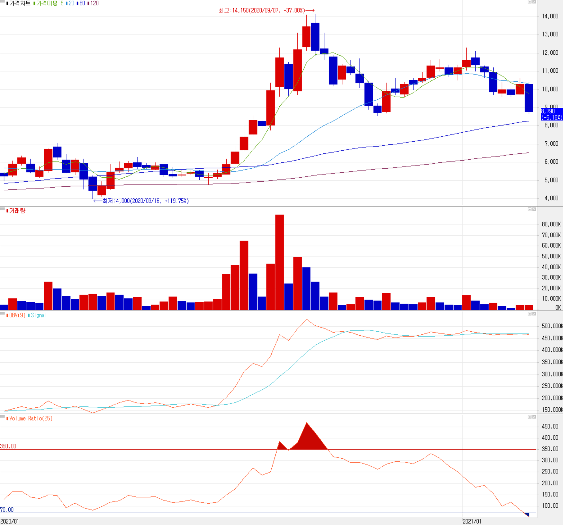 최근 한 달간 수급에서는 외국인과 금융투자 업계가 매수 우위를 보이고 있는 가운데 거래량이 침체된 상황입니다. 최근 하락에 따른 반등이 나올 수 있으나, 추가 하락 시 7,800원 선을 강한 지지라인으로 보고 있으며, 1차 지지선인 8,300원 선을 하향 돌파할지 지켜봐야겠습니다. 당사 포함 5G 관련주들이 대부분 2분기 말부터 실적 회복을 기대하기 때문에, 당분간 수주 상황과 전방산업인 이동통신 사의 동향을 파악하면서 투자에 임해야 할 것 같습니다. 또한 연기금을 비롯한 기관의 수급 상황이 당분간 저조할 것으로 예상되니, 거래량 추이도 함께 지켜보면 좋겠습니다. 전반적으로 쏠리드는 2021년 컨센서스 대비 개인적인 목표주가를 11,000원으로 설정했고, 2분기까지 시장 조정 시 저점 매수하면서 향후 반등을 기대할 수 있는 종목으로 생각하고 있습니다.