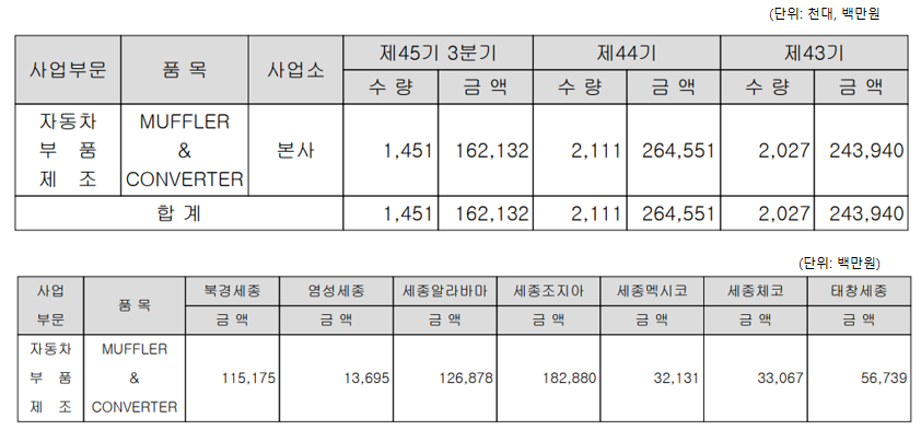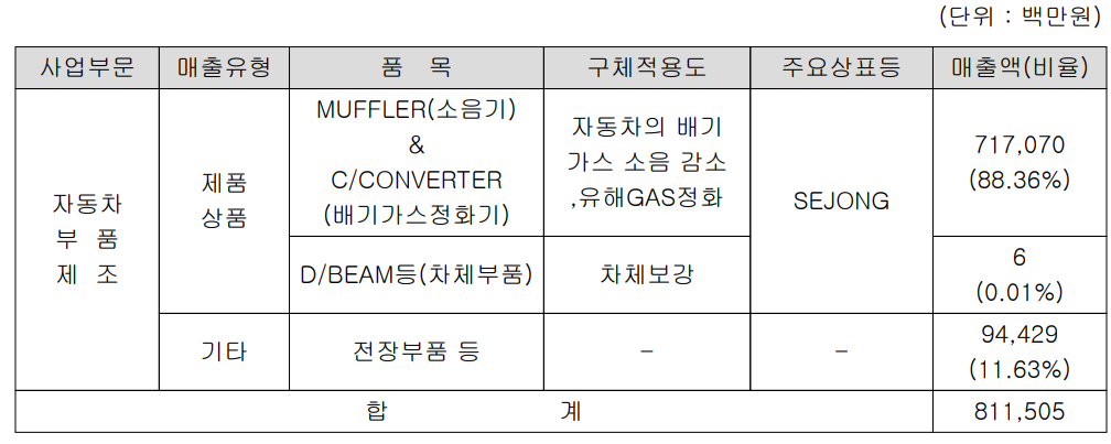 당사의 사업 부문 및 제품 별 매출 현황을 보면 아직까지는 배기가스 소음 감소 장치 및 정화기 등 배기 시스템 관련 부품의 매출이 88.36%의 비중을 차지하고 있어서 주력 사업입니다. 전장 부품 등은 2020년 3분기 말 현재 11.63%의 비중을 보이고 있습니다.