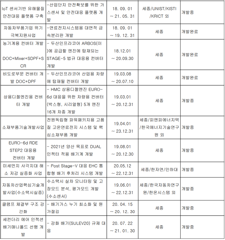 기타 한국 자동차연구원과 한온시스템 등이 공동으로 연구하는 자동차 산업 핵심 기술 개발사업(수소 택시 실증)에 대한 연구 등 다양한 전장 부품과 배기 시스템 관련 부품에 대한 연구 개발을 지속하고 있습니다.