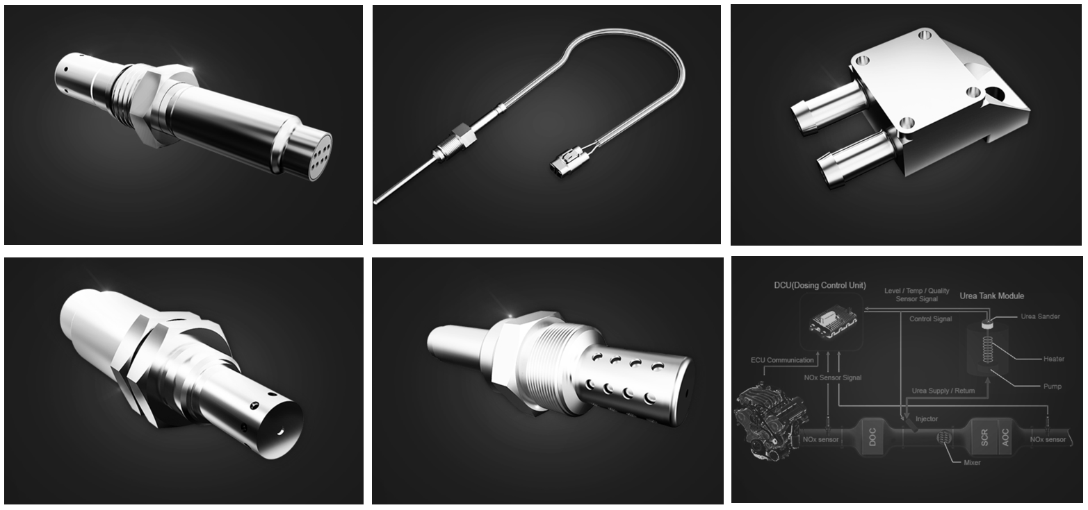 배기시스템 관련된 전장 및 기능 부품에는 질소산화물 센서, 온도 센서, 차압 센서, 산소 센서, PM센서 및 Urea-SCR 시스템 등이 있습니다.