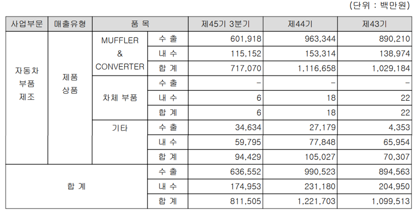 매출 유형별 실적에서는 주요 제품인 배기 시스템 관련 부품에서 수출이 83%의 비중을 차지하고 있으며, 회사 전반적인 매출에서 수출이 차지하는 비중은 78.4%입니다.
