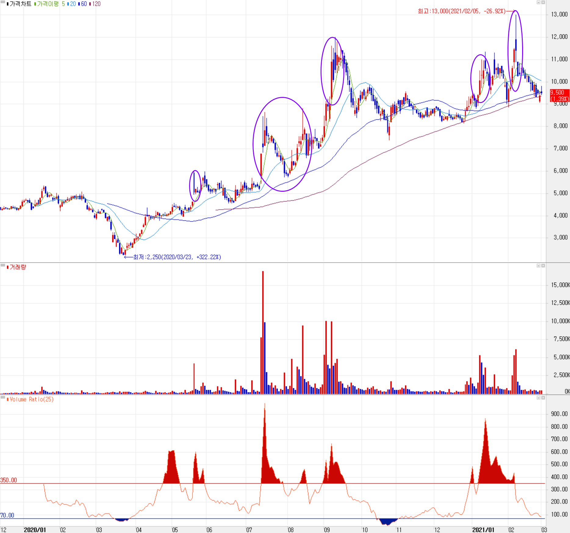지난 1년간 당사의 주가 추이를 보면 코로나19 팬데믹 이후 5월이 되면서 수소 관련 테마 상승이 있었고, 7월에는 탄소배출권 관련, 9월에는 정부의 배출가스 규제안이 나오면서 꾸준히 우상향 했으나 이후 2020년 중반기를 뜨겁게 달구었던 전기차, 수소차 등에서 반도체 관련 종목으로 시장의 수급이 이동하면서 한동한 주가가 힘을 쓰지 못했습니다. 2021년 들어서 미국 대선 확정에 의한 친환경 관련주가 재차 움직이면서 당사의 주가도 전고점을 넘어 최고치인 13,000원을 기록했으나, 최근 조정장세를 만나 거래량 감소와 함께 하락 추세를 보이고 있습니다. 오늘 갭상승 출발하면서 반등을 시도했으나 큰 힘을 받지 못한 채 마감했습니다.