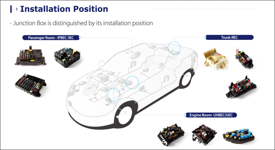 정션박스(Junction Box)란 다양한 커넥터 타입을 서로 변환하여 사용할 수 있도록 해주는 장치입니다. 당사는 PCB type의 정션 박스를 비롯한 Smart Junction Box를 개발하여 경차에서 상용자동차까지 다양한 제품 라인업을 갖추고 있으며, 최근에는 자율주행 자동차에 적용 가능한 통합 기능 정션 박스를 개발하고 있습니다.