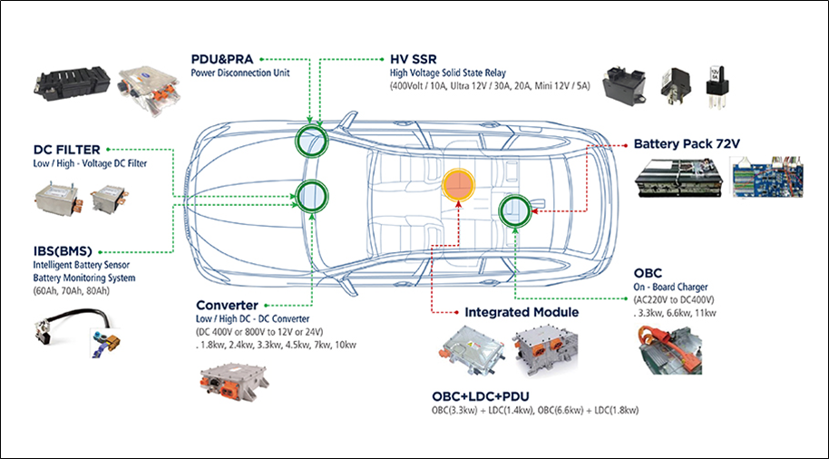 당사는 전기차 부품으로 Converter, OBC(On Board Charger), PDU(Power Distribution Unit), SSR(Solid State Relay), BMS(Battery Monitoring System) 등이 있으며 수소 전기차용 Converter, BHDC(Bi-Direction High Voltage DC-DC Converter, 전력변환기) 등이 있습니다.