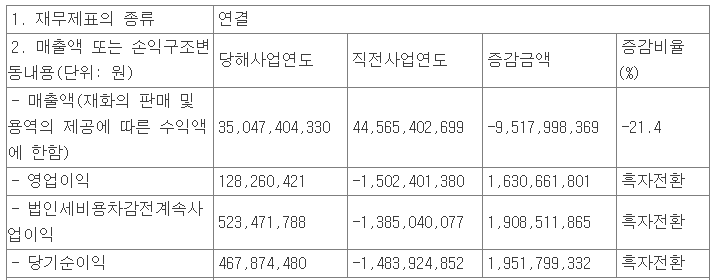 당사는 지난 2월 10일 손익구조 변동에 따른 잠정 실적을 공시했습니다. 2020년 매출액은 350억 원으로 전년 대비 21.4% 감소했고, 영업이익과 당기순이익은 흑자 전환했습니다. 코로나19의 영향으로 전방산업의 둔화에 따른 매출 감소가 있었으나, 내적 원가절감 및 정보보조금 수취 등으로 수익구조는 개선되었습니다.