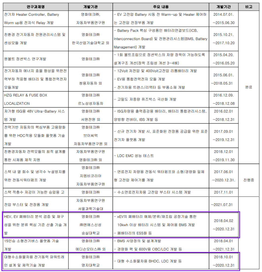 당사는 지난 2018년 정부가 전기차 폐차 시 차량은 폐차를 시키지만, 폐배터리(팩)은 시도지사에게 반납을 의무화하는 등 전기차 배터니 반납에 대한 고시를 제정하면서, "EV/HEV 폐배터리를 이용한 10Kw급 ESS 재사용 기술개발 사업"의 주관사업자로 선정되었습니다.