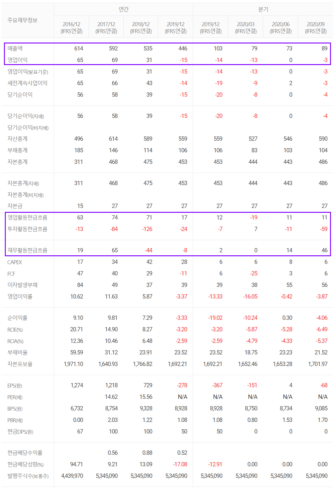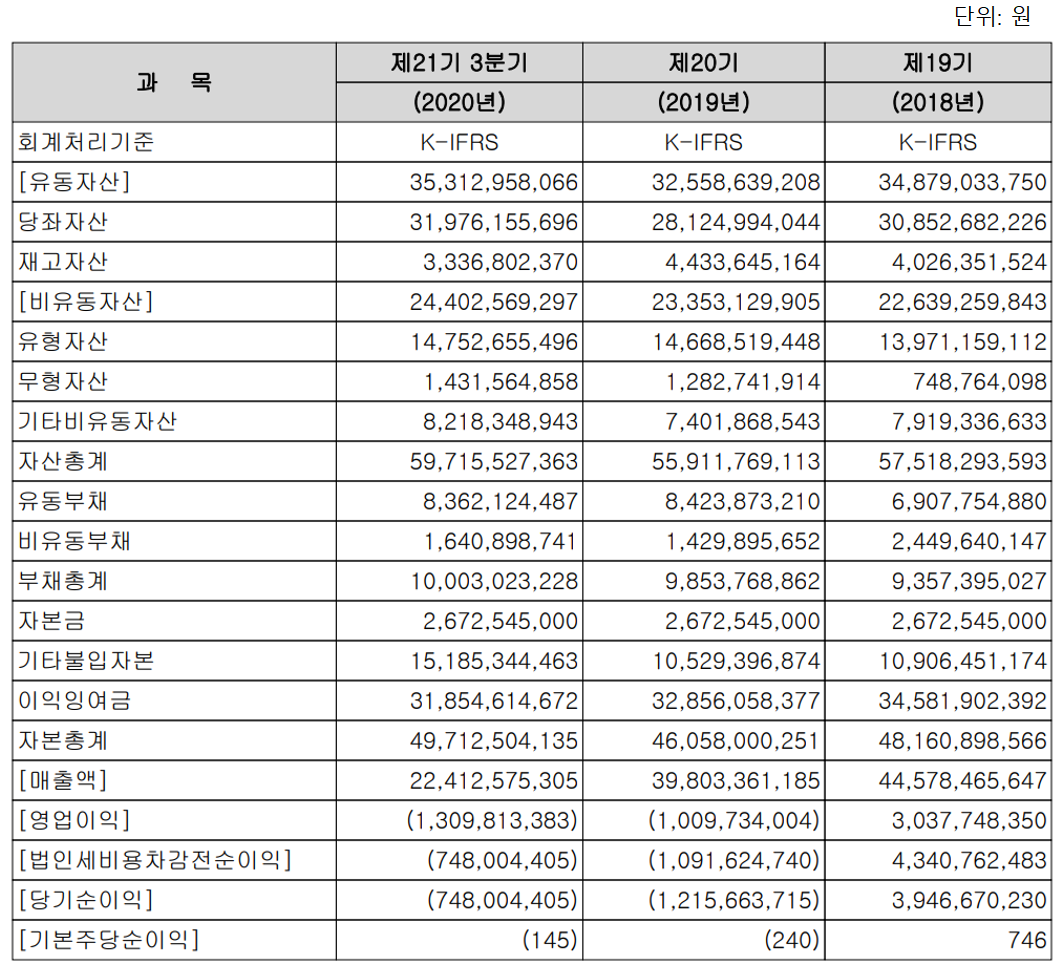 2019년 영업손실을 기록하면서 점차 손실폭이 감소되어 2020년 결산으로 1억 2천8백만 원의 영업이익을 내면서 당사의 내부적 원가절감에 대한 노력이 보이는 것 같습니다.