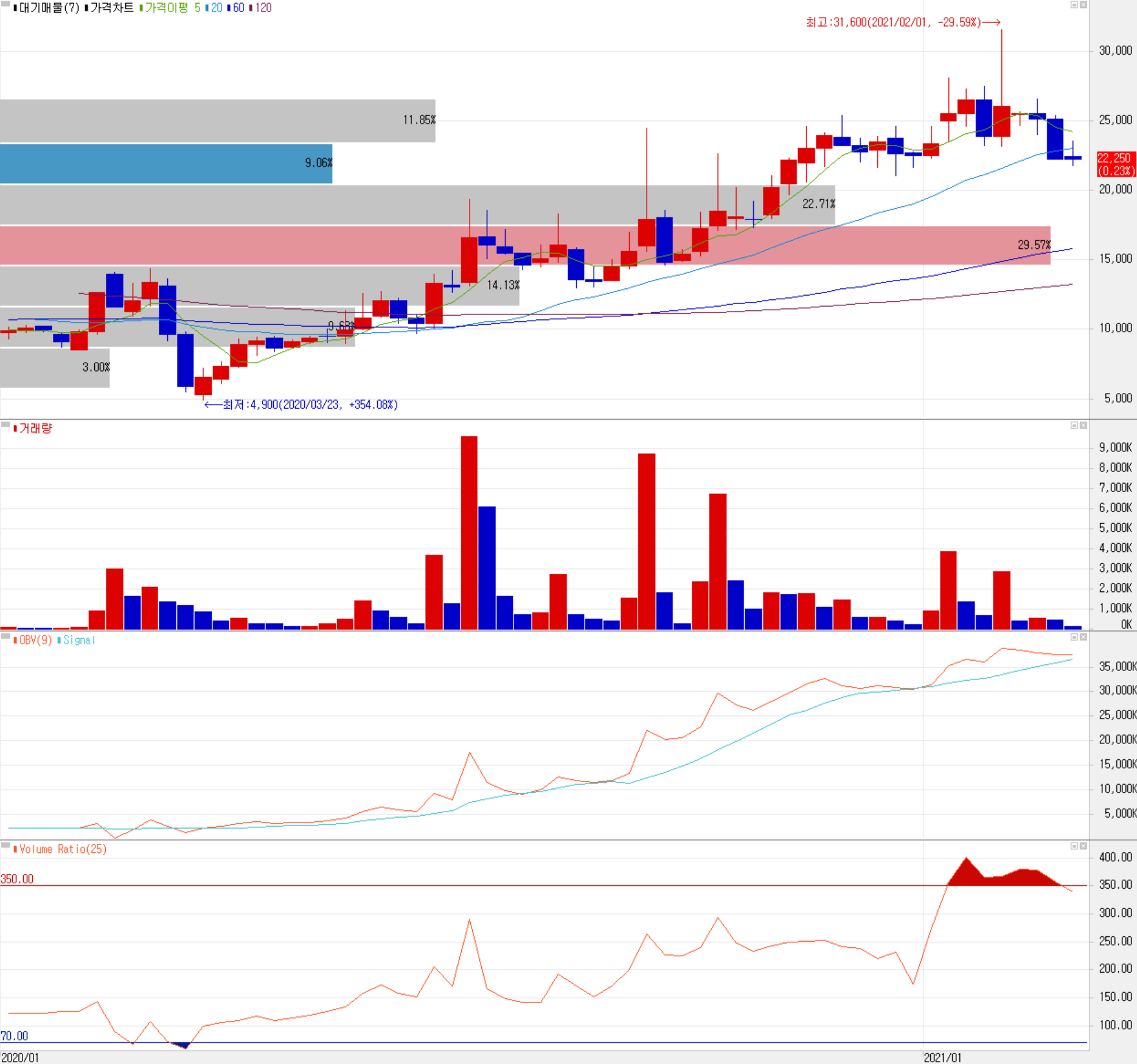 최근 한달 간 수급상황은 기관의 유입은 없다시피 하고, 외국인과 개인의 공방이 계속되는 와중에 개인이 매수 우위를 보이고 있습니다. 주가의 추이를 보면, 지난 7월 이후 수소차 테마, 전기차 관련 부품 수주 및 폐배터리 개발 소식 등으로 꾸준한 상승세를 보이다가 최근 시장의 조정과 함께 당사의 주가도 하락세를 나타내고 있습니다. 시장 전반적으로 중소형 위주의 거래량이 감소하면서 방향성이 없는 상태로 단기적 변동성이 예상됩니다. 추가 조정 시 20,500원 선을 지지하는지 보고 향후 접근방법을 모색해봐야겠습니다. 당사의 중장기 주가의 방향은 최근 전기차 및 수소차 등으로의 사업 체질 변화에 따른 수익성 개선 여부가 결정할 것으로 판단되며, 따라서 1분기 수주 공시 및 실적에 대한 상황을 주목할 필요가 있습니다. 주봉상 중장기 추세는 좀더 기다려봐야 방향을 줄 듯 합니다.