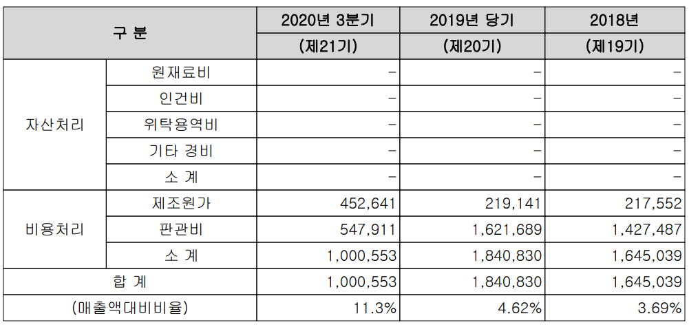 당사는 지난 2020년 3분기 말 기준 전체 매출액의 10%에 해당되는 비용을 연구개발 비용으로 투자했습니다.