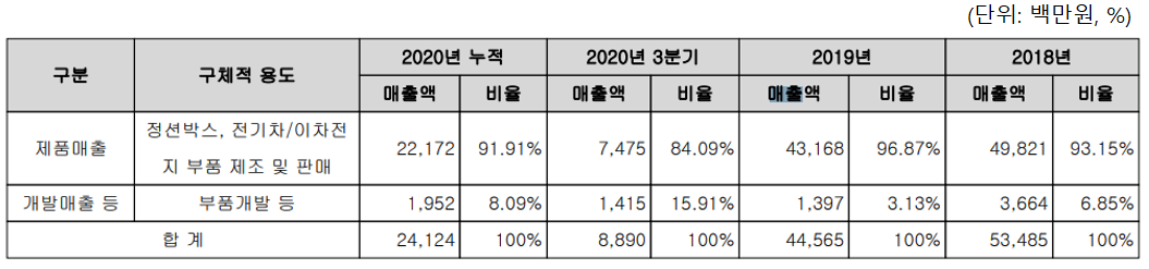 당사는 크게 제품 매출과 개발 매출로 구분되며, 정션박스 및 전기차의 부품 관련 매출이 전체 매출의 90% 이상 차지하고 있습니다.
