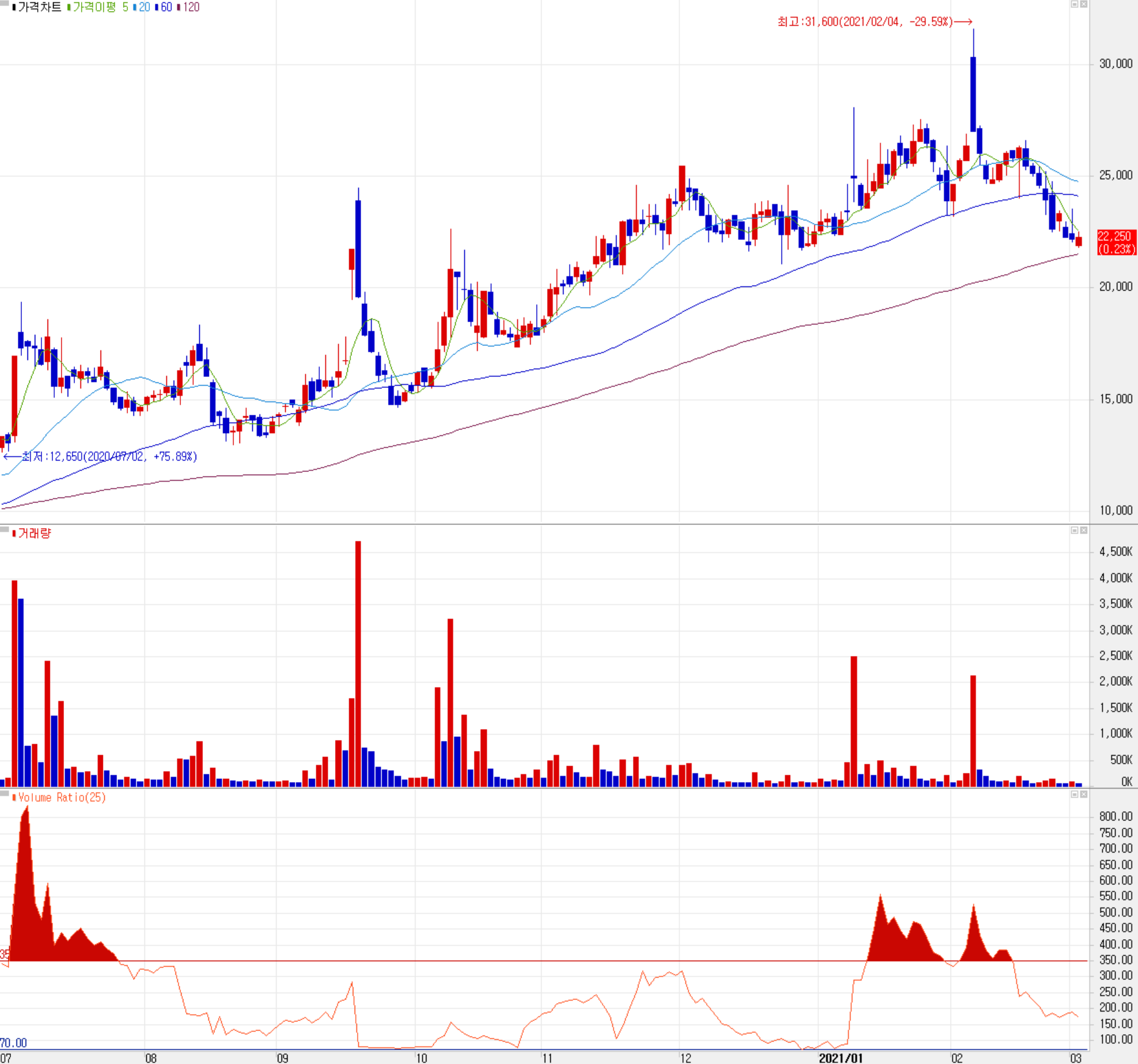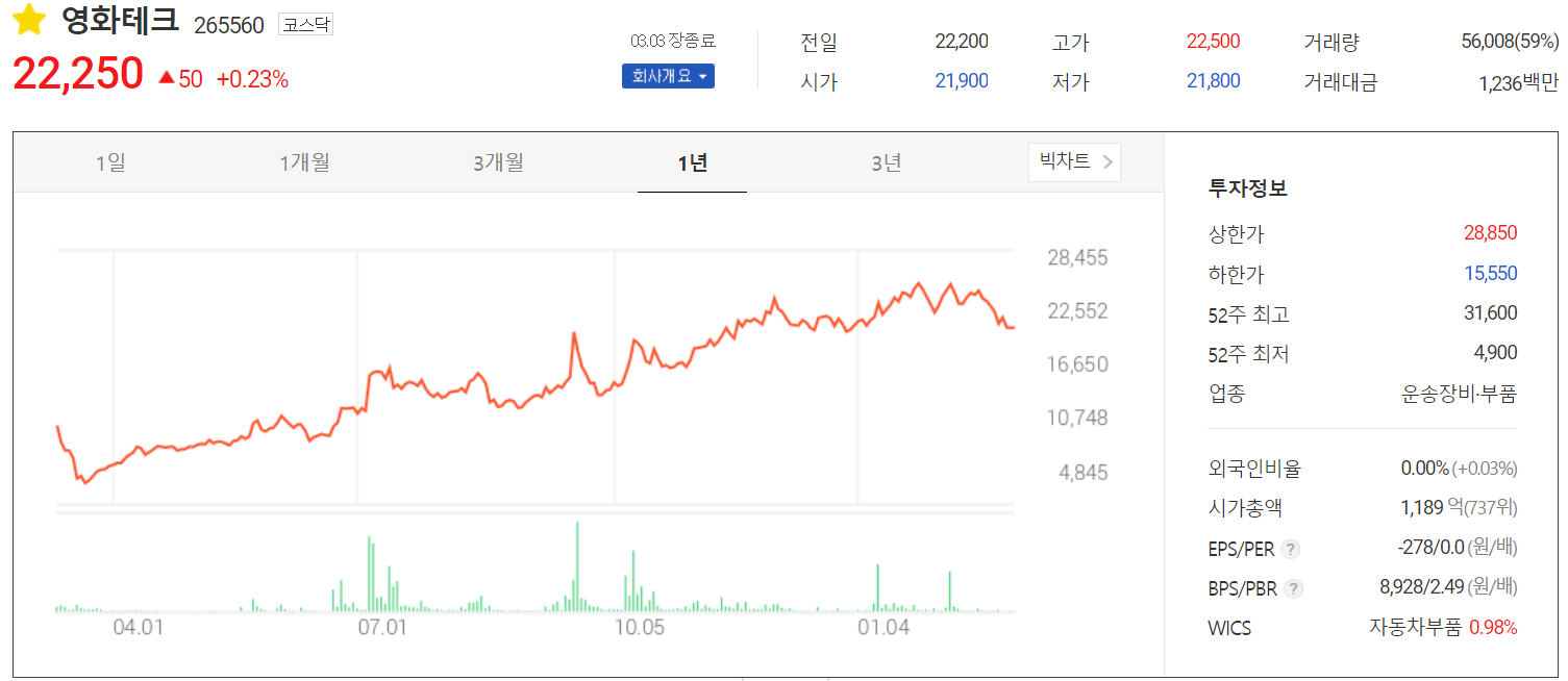3월 3일 장종료 기준 22,250원에 거래를 마쳤습니다. 시가총액 1,189억 원으로 코스닥 시총 상위 737위 종목입니다.