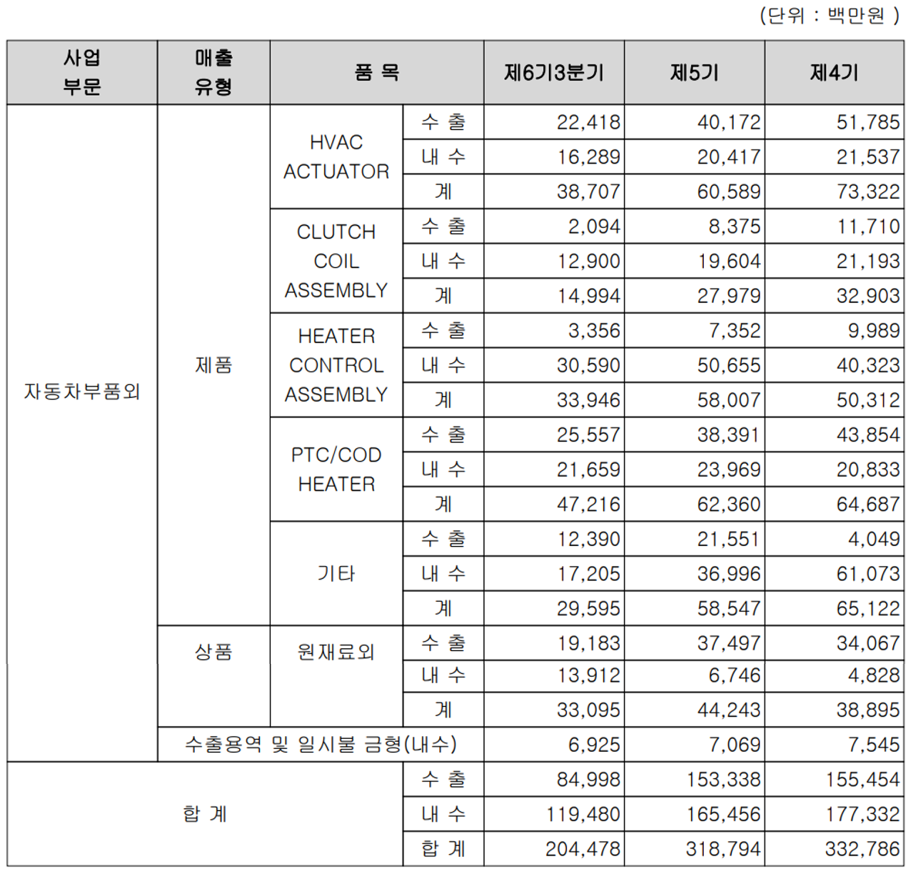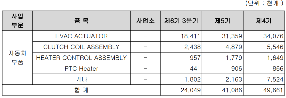 전반적으로 당사의 주요 제품의 수출과 내수의 비중은 HVAC Actuator, PTC heater는 수출의 비중이 높은 반면, Heater control. Clutch Coil의 경우 내수의 비중이 월등히 높습니다.