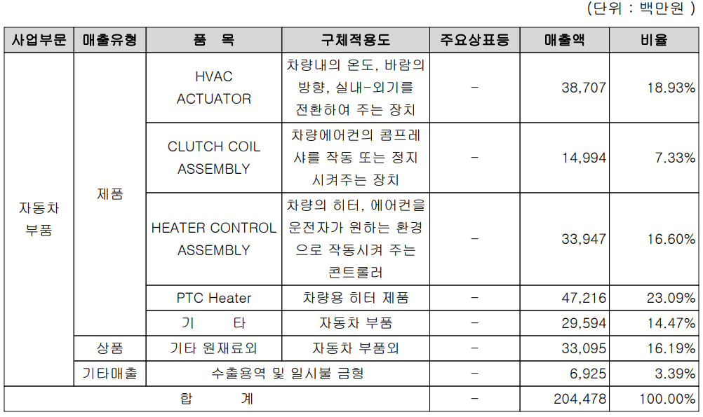 당사의 주요 제품 별 매출에는 PTC Heater가 23.09%, HVAC Actuator 18.93%, Heater Control Assembly 16.60%, Clutch Coil 7.33% 의 비중을 차지하고 있습니다.