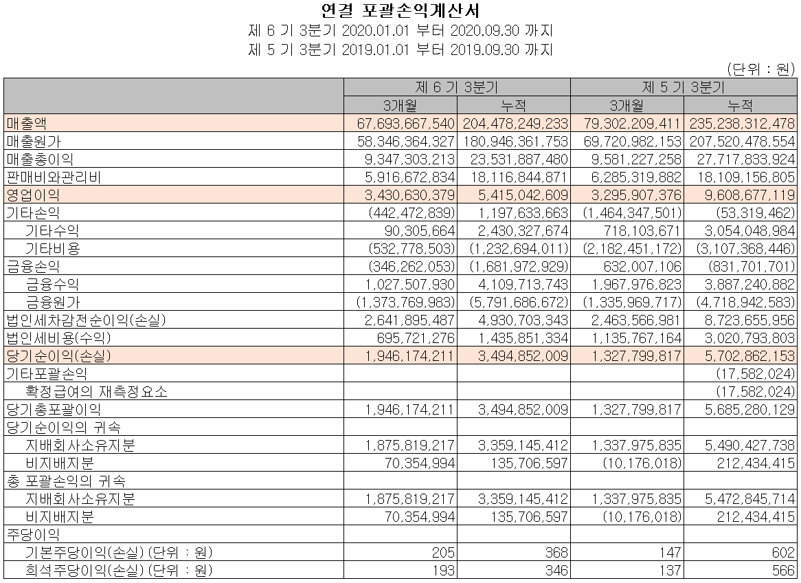 당사의 2020년 3분기 누적 기준 매출액은 2,045억 원으로 전년 동기 대비 13.08% 감소했고, 영업이익은 54억 원으로 43.64% 감소했습니다. 코로나19의 영향으로 인한 전방 산업의 수요 부진으로 매출액과 이익 모두 감소했으며, 고정비 등 판관비 부담으로 영업이익이 대폭 감소한 것으로 판단됩니다.