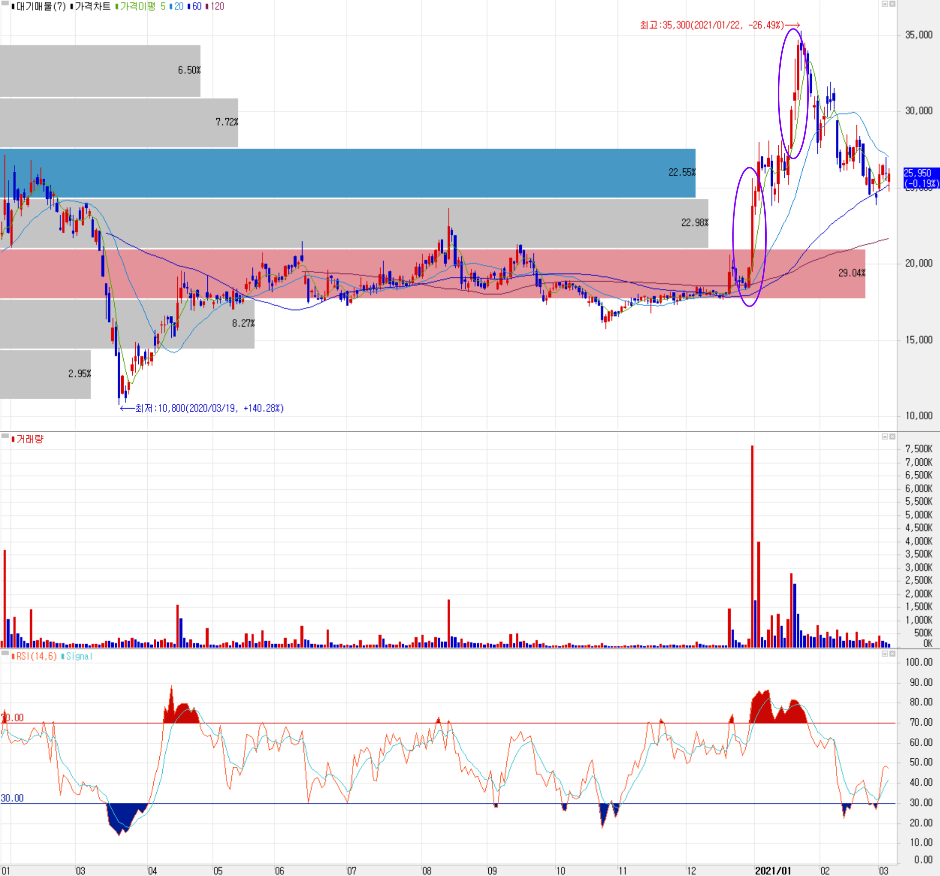 최근 수급에서는 외국인과 개인의 공방이 치열한 가운데 개인의 매수 우위가 보이고 있으며, 기관의 수급은 낮은 수준이지만 금융투자 업계의 8 거래일 연속 순매수가 눈에 띕니다. 지난 12월 과 1월 사이 급등에 따른 매물 소화 과정과 시장의 조정에 따른 하락이 진행되다가 최근 박스권 횡보하는 모습입니다.