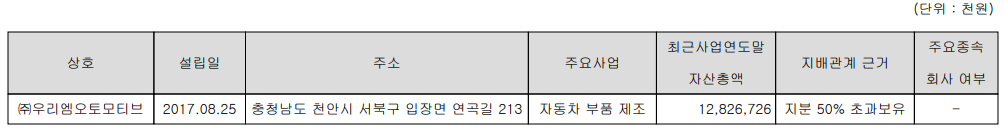 | 2017.08.24 | (주)우리엠오토모티브 계열회사 편입 |