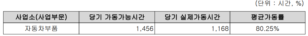 당사의 평균 가동률은 80.25%로 낮은 편은 아니지만, 코로나19로 인한 전방 산업의 부진으로 생산 실적은 저하된 상황입니다.