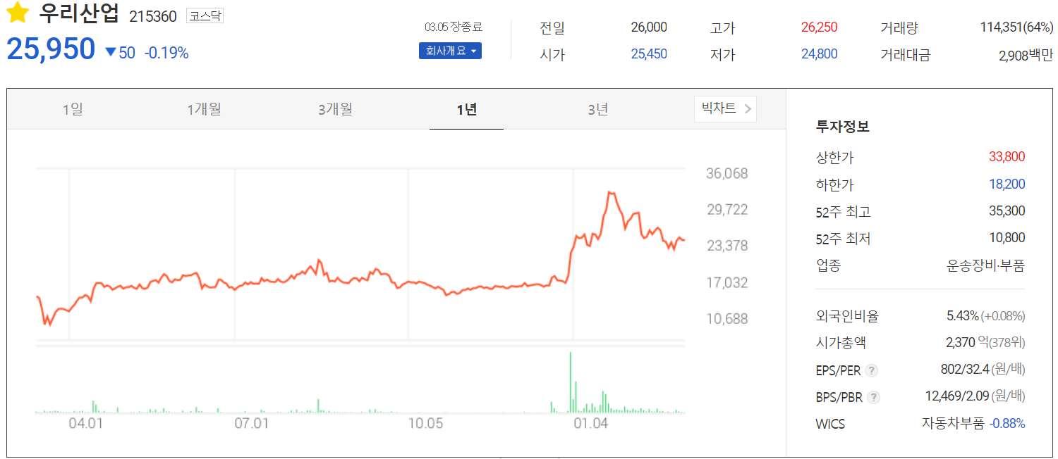 당사의 주가는 3월 5일 장 종료 기준 25,950원에 거래를 마감했습니다. 외국인 비중은 5.43%이며, 시가총액 2,370억 원으로 코스닥 시총 상위 378위 종목입니다.