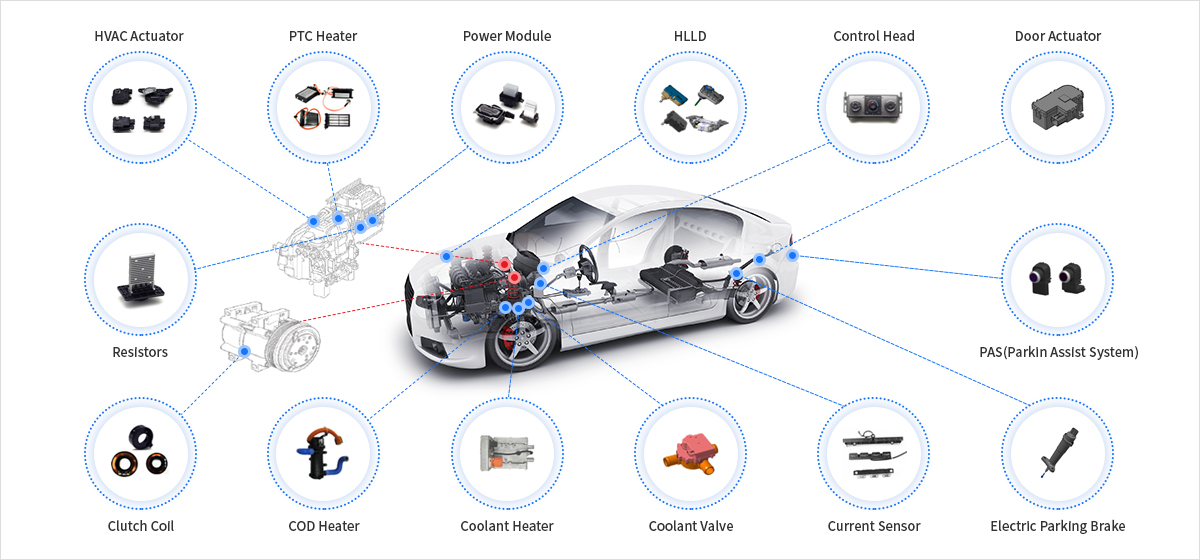 당사는 차량용 HVAC actuator,Clutch Coil, Heater Control, PTC Heater 및 자동차용 전장 부품 등을 공급하고 있습니다.