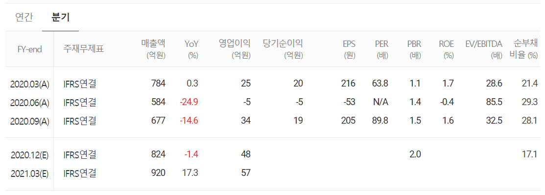 당사의 2020년 4분기 컨센서스는 매출액 824억 원, 영업이익 48억 원을 추정했습니다.