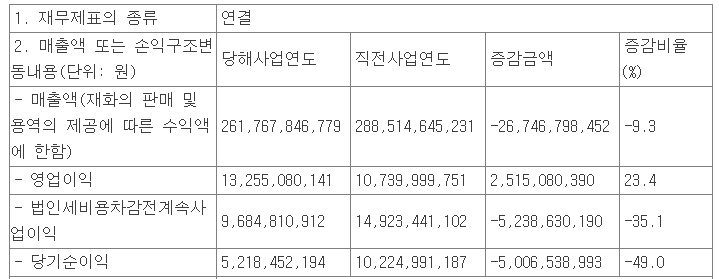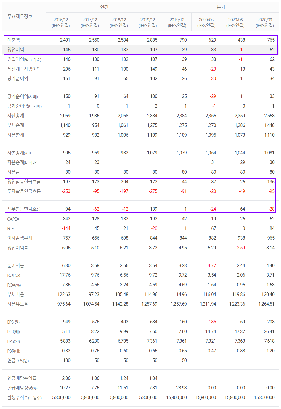 지난 2월 16일 당사의 공시에 의한 2020년 잠정 실적 기준 매출액은 2,618억 원으로 전년 대비 9.3% 감소했고, 영업이익은 132억 원으로 23.4% 증가, 당기순이익은 52억 원을 기록하면서 전년 대비 49% 감소했습니다. 코로나19의 영향으로 전방 산업의 수요 감소에 따른 매출 부진이 나타났으나, 당사의 내부적 노력으로 원가절감 등을 통해 영업이익은 증가했습니다. 다만, 환율 변동에 따른 외환손실로 이익은 감소했습니다.