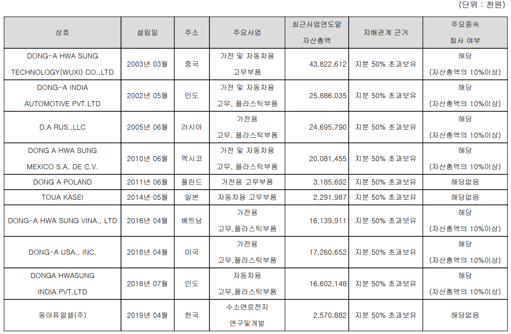당사는 중국, 인도, 러시아, 멕시코, 폴란드, 일본, 베트남 등 9개의 해외 현지법인을 보유하고 있으며, 지난 2019년에는 당사와 한국에너지기술연구원이 합작 투자하여 연료전지 시스템 사업화를 연구하는 기업인 동아퓨얼셀을 설립하였습니다. 당사의 최대주주는 지분율 40.65%를 보유하고 있는 대표이사 본인 임경식입니다.