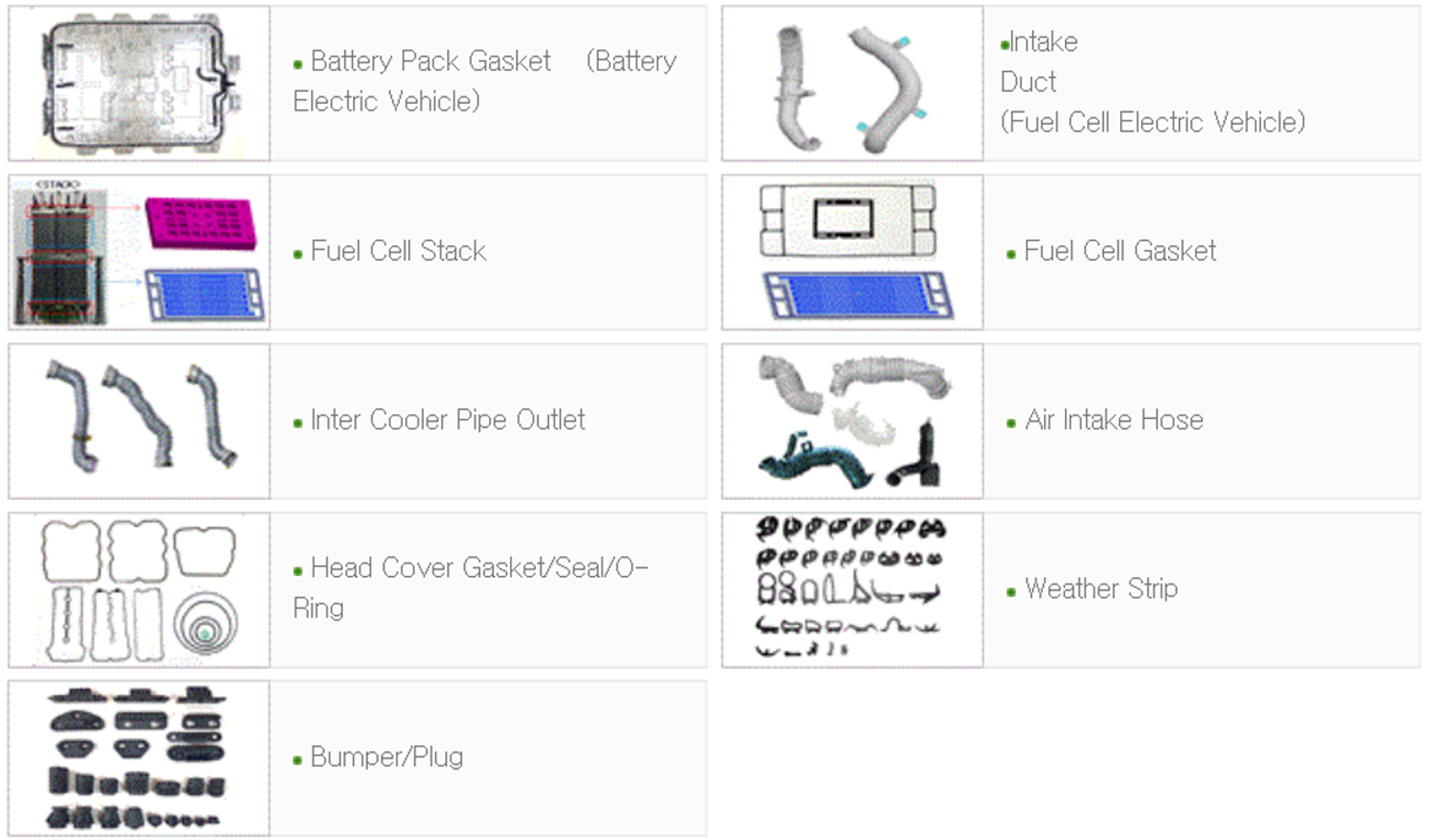 배터리 팩 가스켓은 현재 미국 GM, 현대/기아차, 중국 장성기차, 중국 제일기차 등에 납품하고 있으며, 지난 2020년 발표된 현대자동차의 전기차 전용 플랫폼인 'e-GMP'에 공급사로 선정되어 2022년까지 공급할 예정입니다.