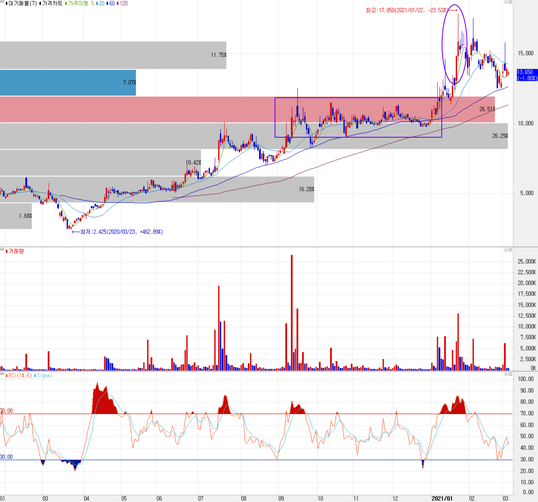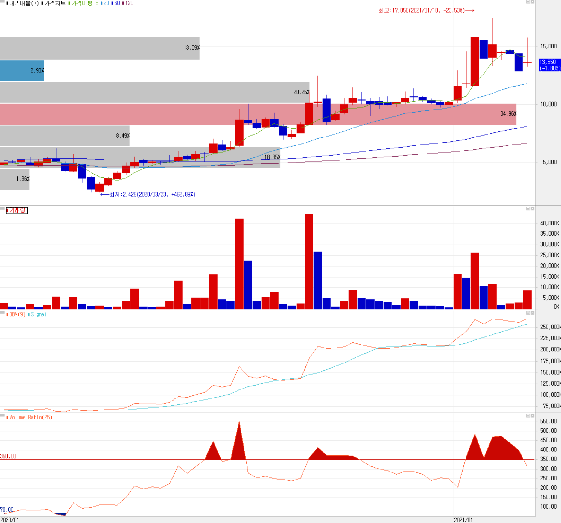 당사의 주가는 2020년 코로나19 팬데믹 이후 회복되면서 꾸준히 상승하다가 지난 9월부터 올해 1월 초까지 긴 박스권 등락을 보였습니다. 1월 말에는 현대차 그룹의 수소자동차를 위한 중장기 로드맵을 발표하면서 당사가 관련 수혜 종목으로 급등했으나 2월까지는 시장의 전반적인 조정에 따른 하락으로 상승 분을 되돌렸습니다. 최근 한 달간 수급에서는 개인과 금융 투자 업계의 매수 우위가 돋보이며, 기타 기관계와 외국인은 매도 우위를 보이고 있습니다. 기술적으로는 조만간 방향성을 줄 것 같습니다만, 시장 변동성이 크고 거래량이 줄어드는 형국이라서 12,500 ~ 15,800원 사이에서 움직일 것 같습니다. 개인적으로 목표주가는 16,500원으로 설정하고 저점 매수 기회를 찾을 예정입니다.