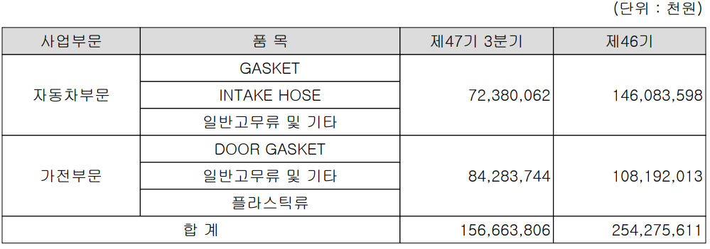 | 주요 품목 | 자동차 및 가전 제품의 가스켓 등 |