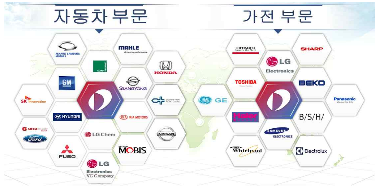 당사는 자동차 부문의 현대차, 기아차, GM, HONDA, Ford, Fuso, Nissan 등 글로벌 유수의 완성차 업체는 물론 글로벌 배터리 제조사인 LG화학, SK이노베이션도 고객사로 확보하고 있어 안정적인 매출을 유지할 수 있습니다. 가전부문도 국내에는 LG전자, 삼성전자를 비롯하여 해외애는 월풀, 베코, 파나소닉, 도시바, GE, 일렉트로룩스 등 글로벌 가전제품 제조사에 당사의 부품을 공급하고 있습니다.
