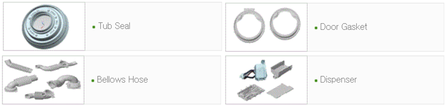 세탁기 통에 조립하여 도어 글래스와의 실링(Sealing) 역할을 하며, 진동 흡수 및 완충 기능을 하는 부품입니다. 당사는 저 경도 재료를 적용하여 세탁기 작동 시 진동과 마찰성을 향상시킨 제품을 공급하고 있습니다.