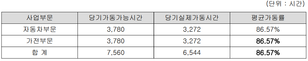 자동차 전방 전방산업의 수요 감소로 인해 자동차 부문의 생산 실적은 감소했고, 가전 부문은 나쁘지 않은 실적을 거두고 있습니다. 당사 전반적인 평균 가동률은 86.57%를 기록했습니다.