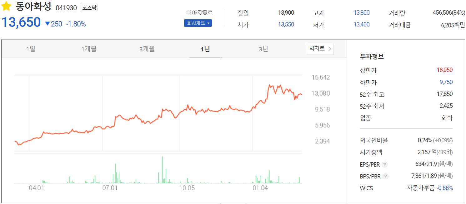 3월 5일 장종료 기준 당사의 주가는 13,650원에 거래를 마쳤습니다. 외국인 비중은 0.24%로 낮은 편이며, 시가총액 2,157억 원으로 코스닥 시총 상위 419위 종목입니다.