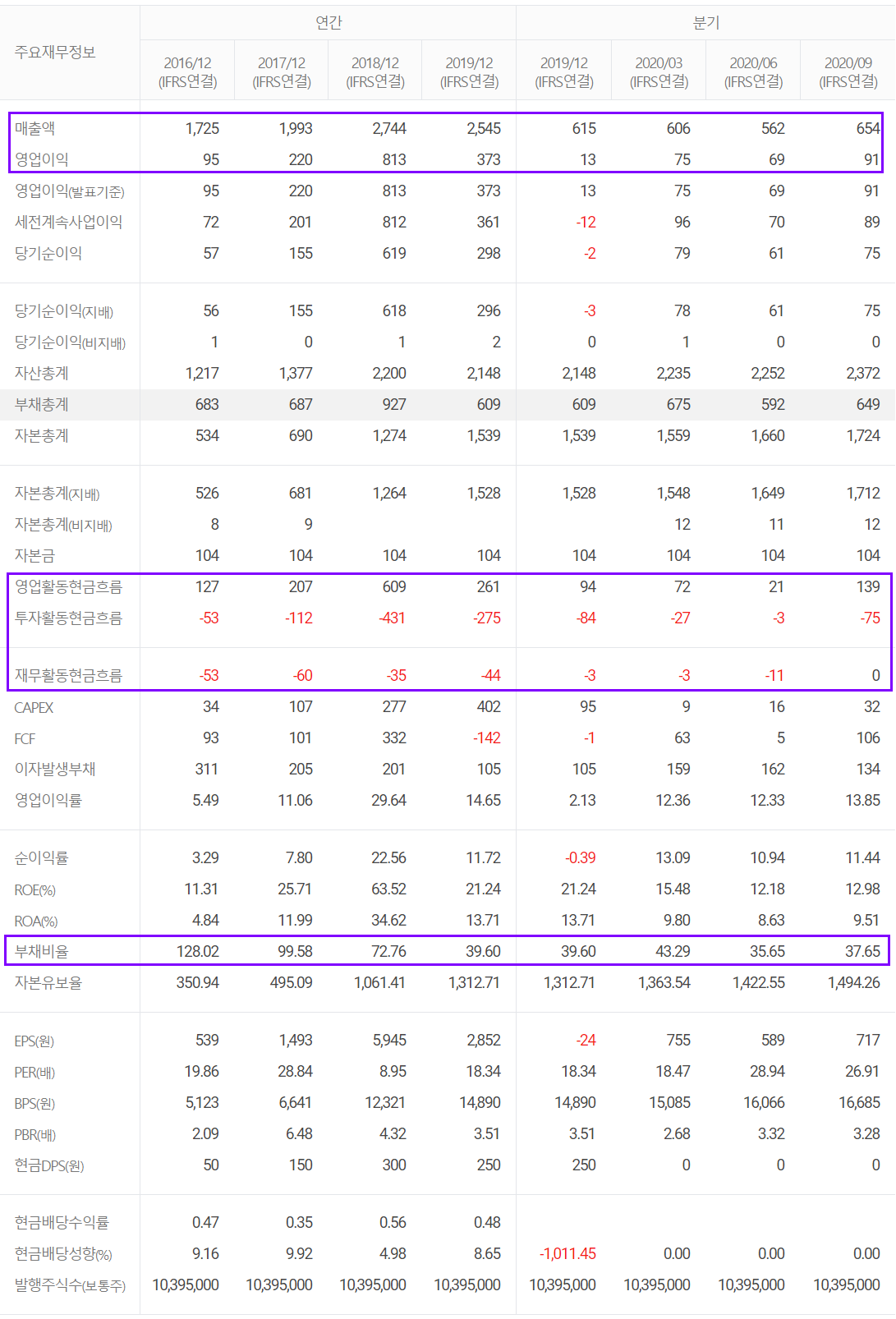 2019년 대비 이익은 감소했으나 영업활동으로 인해 창출된 현금으로 투자활동도 활발한 것으로 보입니다. 또한 2016년부터 부채도 꾸준히 감소하는 모습을 보이면서 안정적인 재무구조를 보이고 있습니다.