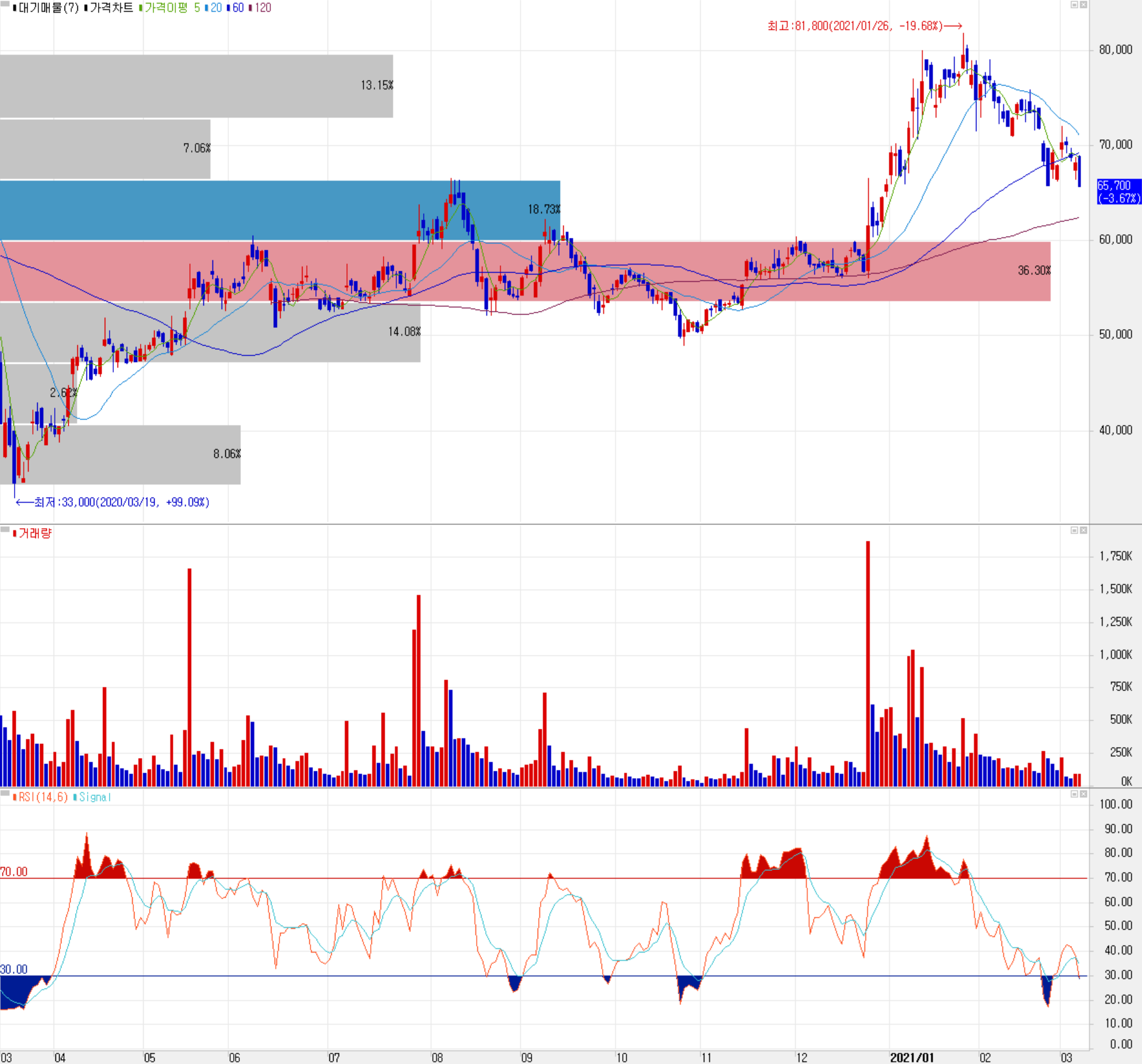 당사의 주가는 MLCC 테마 주로서 지난 12월 말부터 가파르게 상승하다가 2월 들어서 시장의 조정 및 당사의 2020년 실적이 시장 기대치를 하회하면서 하락세를 보이는 상황입니다. 특히 최근 한 달간 수급에서는 외국인과 개인의 매물을 기관이 받아내는 모습입니다. 연기금 포함 대부분의 기관계가 고르게 매수 우위를 보이는 점은 긍정적입니다. 반도체 및 자동차 전장용 테마에서 다시 반등하기 위해서는 1분기 실적이 중요할 것 같습니다. 기업의 펀더멘탈이나 기술적 가치를 고려할 때 당사의 목표주가는 개인적으로 80,000원으로 설정했으나 변동성이 심하고, 거래량이 침체된 상황에서는 62,000원, 60,000원을 각각 지지선으로 보고 단기적 접근을 고려해야 할 것 같습니다. 중장기적 투자 매력이 있는 종목이니 하락 시 소량 매집하는 전략이 유효합니다.