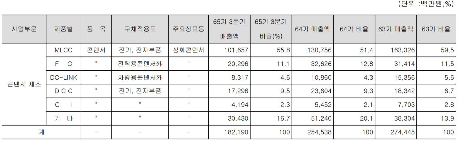 당사는 1985년 독자 기술 기반으로 MLCC의 개발 및 양산에 성공하면서 당사의 주력 제품으로 다양한 고부가가치 전자제품에 주로 사용되면서 수요가 증가 추세에 있습니다. 일반 전기 전자 제품에 사용되는 MLCC와 자동차 전장용으로 사용되는 MLCC로 구분됩니다.