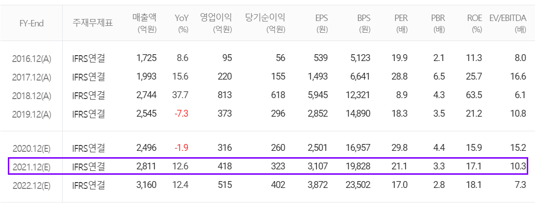 2021년에는 매출액 2,811억 원으로 13.73% 증가하고, 영업이익은 418억 원으로 54.24% 증가할 것으로 추정했습니다.