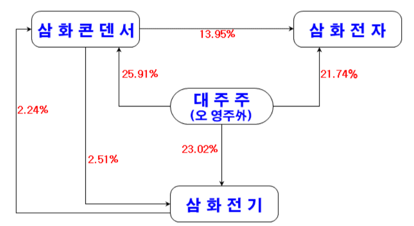 당사를 모회사로 당사의 대표이사인 오영주 본인이 25.91%의 지분으로 최대주주이며, 계열사인 삼화전자 및 삼화전기에도 각각 21.74%, 23.02%의 지분율로 최대주주입니다.