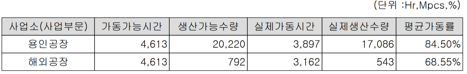 2020년 3분기 누적 기준 평균 가동률은 용인 공장의 경우 84.5%, 해외 현지 공장 평균은 68.55%를 기록했습니다.