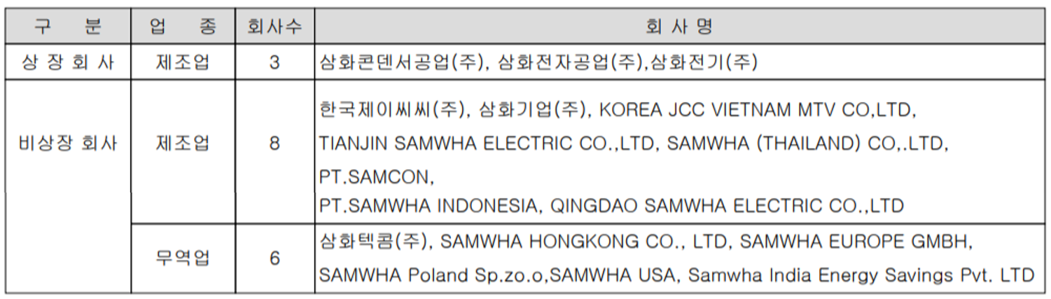 당사가 모기업인 삼화콘덴서공업(주)는 1973년 12월 삼화전기(주), 1976년 4월에는 삼화전자공업(주)를 설립하여 현재 당사 포함 3개의 상장 사와 14개의 비상장회사로 구성되어 있습니다.