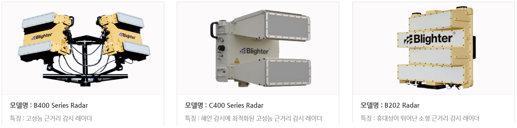 근거리 감시체계에 적용되는 레이더는 영국 BSS사(Blighter Surveillance System)의 파트너로서 국내 레이더 판매와 유지보수를 담당하고 있습니다. 또한 BSS와의 기술협력을 통해 국내에서 면허생산을 진행 중이며, B422 근거리 감시 레이더 제품의 경우 한국 육군 및 해병대에 배치되어 경계작전용으로 운용 중이고, 드론 비행시험장 3개소의 드론 관제용 레이더로 선정되었습니다.