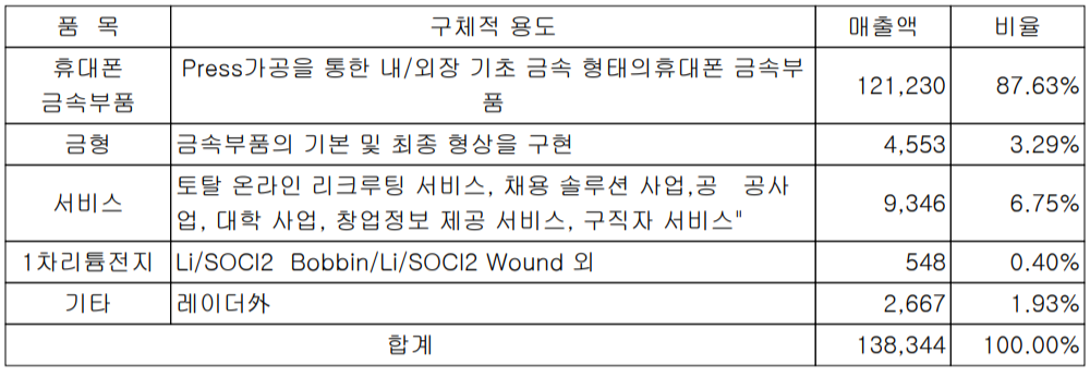 사업 부문 별 매출에서는 휴대폰 관련 금속 가공 부품이 전체 매출의 87.63%를 차지하였으며, 금형 사업이 3.29% 그리고 리크루팅 서비스 등을 제공하는 사업에서는 6.75% 의 매출 비중을 보이고 있습니다.