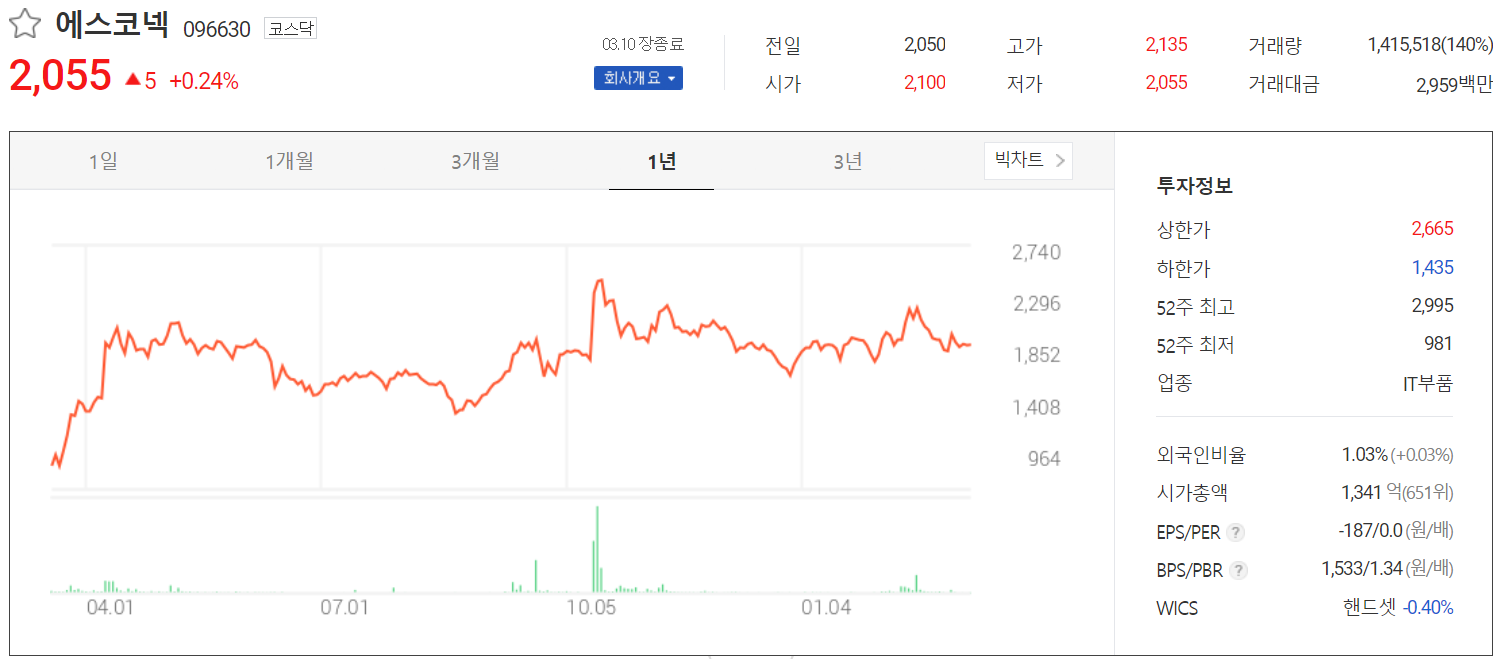 3월 10일 장 종료 기준 2,055원에 거래를 종료했습니다. 외국인 비중은 1.03%이며, 시가총액 1,341억 원으로 코스닥 시총 상위 651위 종목입니다.