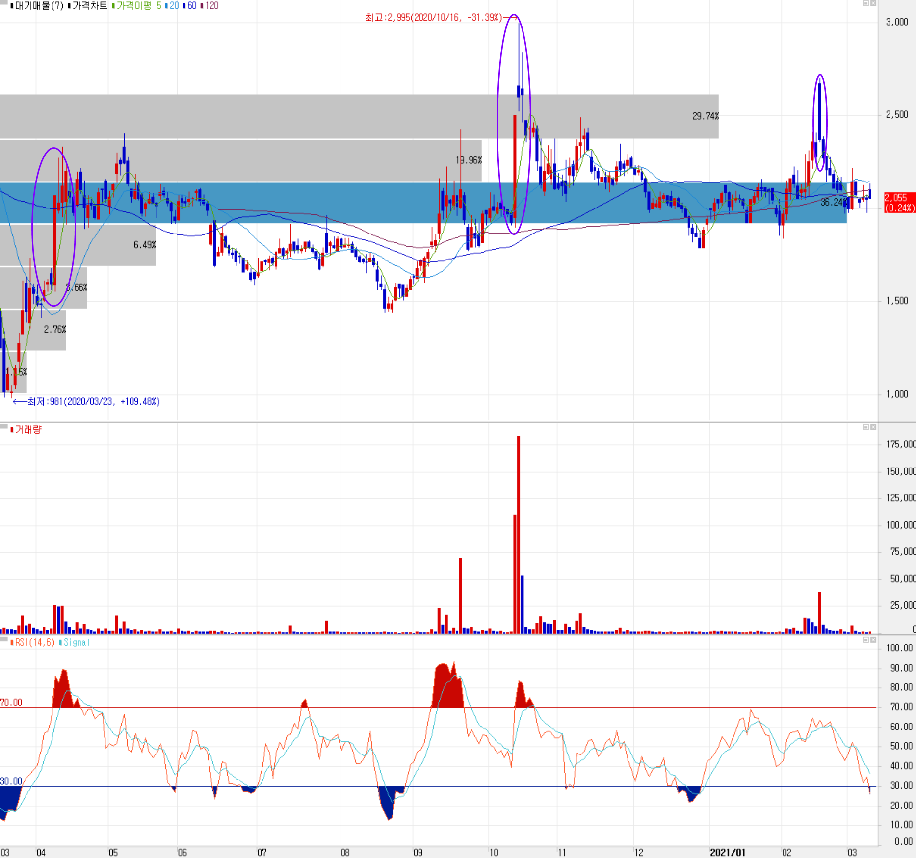 작년 3월 코로나19 팬데믹 이후 삼성전자의 폴더블 폰 출시 예정 소식에 당사의 주가는 단숨에 2배 이상 급등하면서 2,000원 대를 유지했으나 10월 들어 정부의 수소경제 테마가 나오기 전까지는 거래량 감소와 함께 주가가 힘을 쓰지 못했습니다. 지난 2월에는 베트남향 모바일 부품의 수출 증가 등에 따라 주가가 상승했으나, 시장 전반의 조정과 함께 하락하면서 현재 2,000원 근처를 유지하고 있습니다.