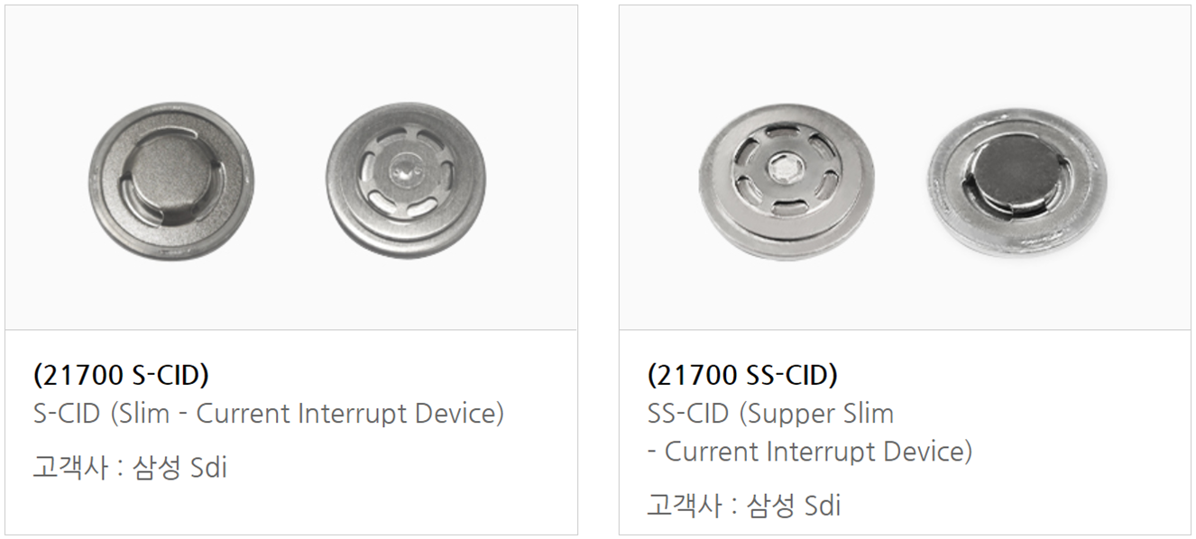 2차전지는 외부로부터 충격을 받거나 과충전이 되면 과전류와 가스가 발생하고 온도와 압력이 상승하기 때문에 전지 내에 압력이 상승하면 외부로 가스를 배출하여 폭발을 방지하는 부품이 필요한데 Cap Assembly가 그 역할을 하며 현재 삼성SDI에 공급하고 있습니다. 현재 Cap에 대한 지속적인 연구개발뿐만 아니라, 2 차 전지용 캔 도 생산할 계획입니다.