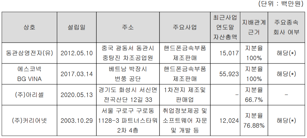 당사는 2020년 3분기 말 현재 4개의 종속회사를 보유하고 있으며, 핸드폰 금속부품의 제조 및 판매를 하는 중국 동관과 베트남 박장시에 각각 현지 법인이 있고, 2020년 5월 1차전지의 제조 및 판매를 목적으로 설립된 (주)아리셀 그리고 취업 정보 제공 등을 영위하는 (주)커리어넷 등이 있습니다.