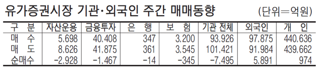 코스피 시장 기관, 외국인 및 개인 매매동향
